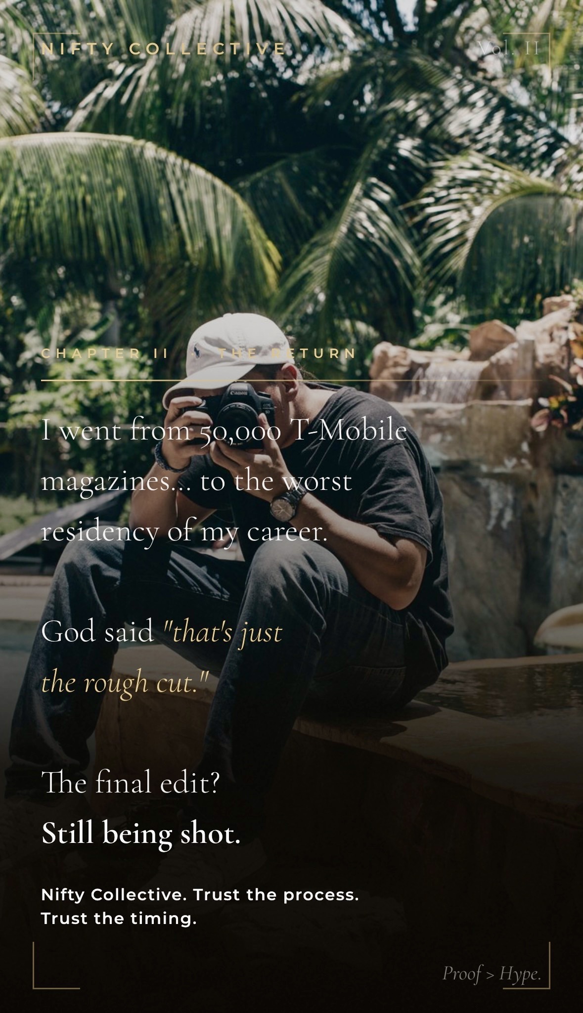I went from shooting 50,000 T-Mobile Magazines to the worst residency of my career. Most people don't survive that creatively. Nifty Collective was built from the other side of that story. Incarceration didn't take my vision, it sharpened it. A Miami based creative agency built on one philosophy: Proof Over Hype.